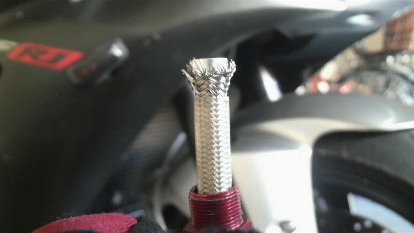 テフロンホースとメッシュの間にアイスピックみたいなものを少しずつ入れて解して行くんですけども、この作業が滅法面倒なんですよ。しかもコレが綺麗に出来てないとガツンとカシめられないんだそうで、やたらと気を遣う作業だったりもする。