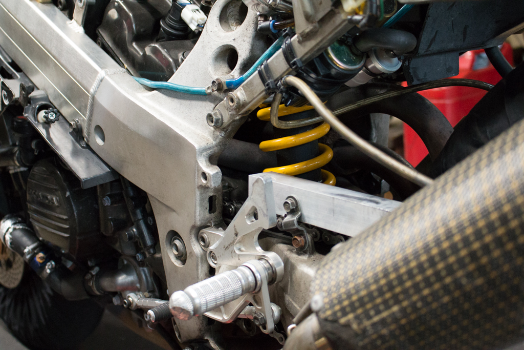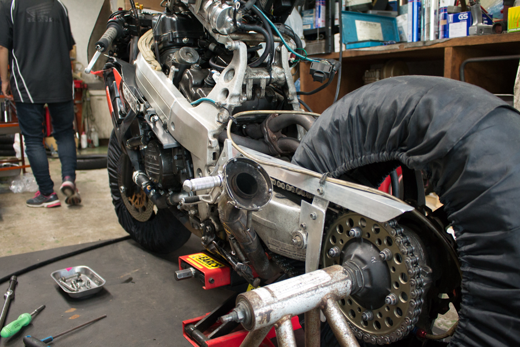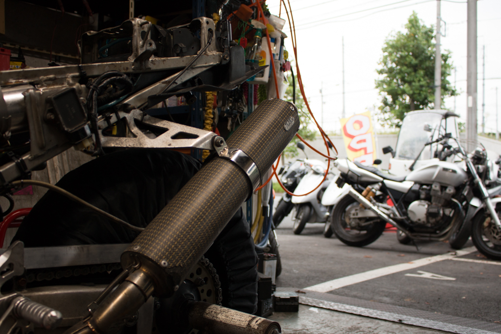 なんでこう仕込んでもいないネタが次から次へと披露されるのか…と少し放心して『と…とりあえず、ツイートでもしたら良いのかな…』とか言っていたら、我らが頼れる兄貴、社長がオーバーホールに出すのと同じベースのサスを出して来てくれて、マフラーも駐車場に停まってるRVFから外して着けてくれて『これでとりあえず練習に行っておけ』と。