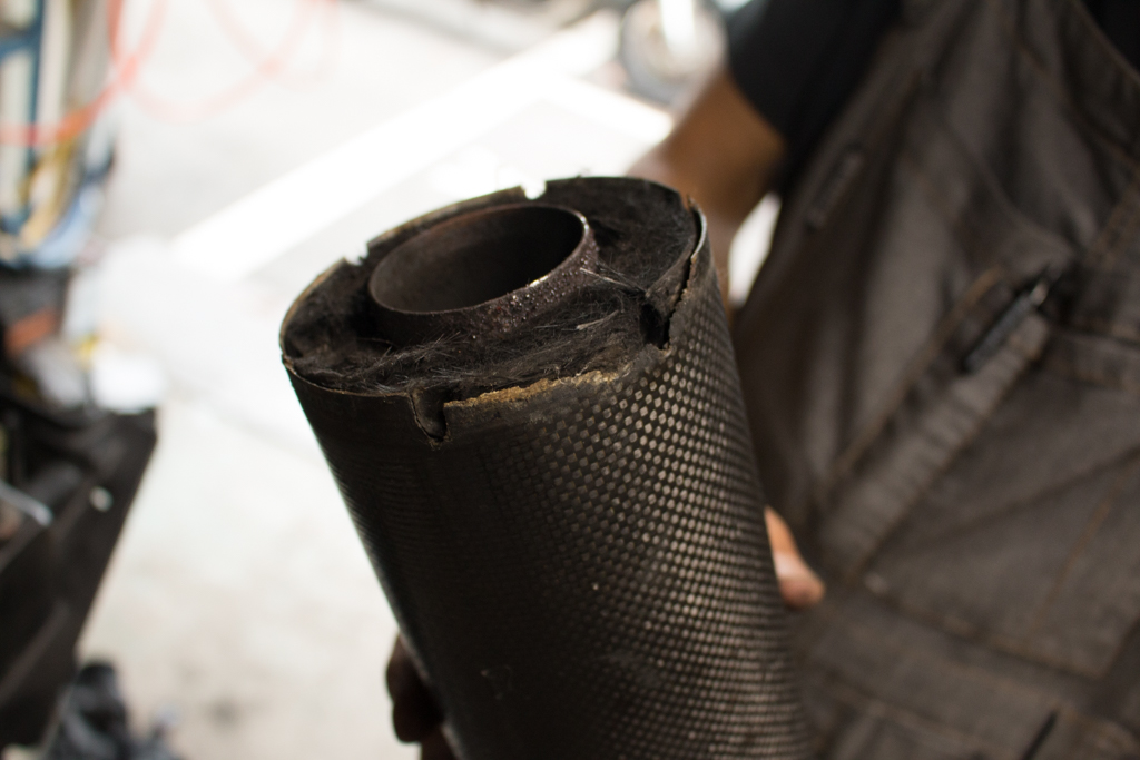 ところで、このリアサスを引っこ抜くのに社長がシートレール持ち上げて上から抜こうっつって、外すもん外して最後にマフラーのステーを緩めてボルトを抜いたらゴトンって何やら鈍い音がした。