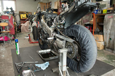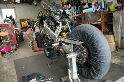 マフラーとリアブレーキのリザーバーとラジエターのリザーバーを外してシートレールを跳ね上げる。