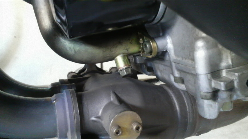 5PWのクーラントのドレインボルトはオイルフィルターのすぐ下辺りにある10mmのボルトなんですけども、これをそのまま外すとどう考えてもEXUPの辺りにどばっとクーラントが掛かってビショビショになってしまうトコについている。