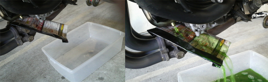 リザーブタンクを取り外してリザーブ分も捨てたらラジエターの内部をレッツ洗浄なんですけども、リザーブタンクは部屋に持って行って水道水で洗って、ラジエター本体の方は下に受け皿を置いてクーラントの注入口から1.5リットルのペットボトルを良く洗って水道水を入れといたヤツで水をジャブジャブ送り込む。