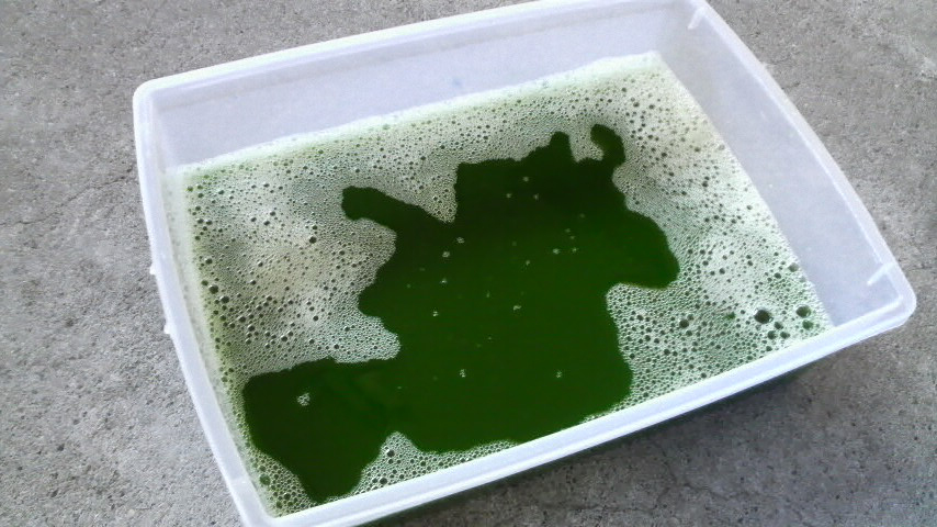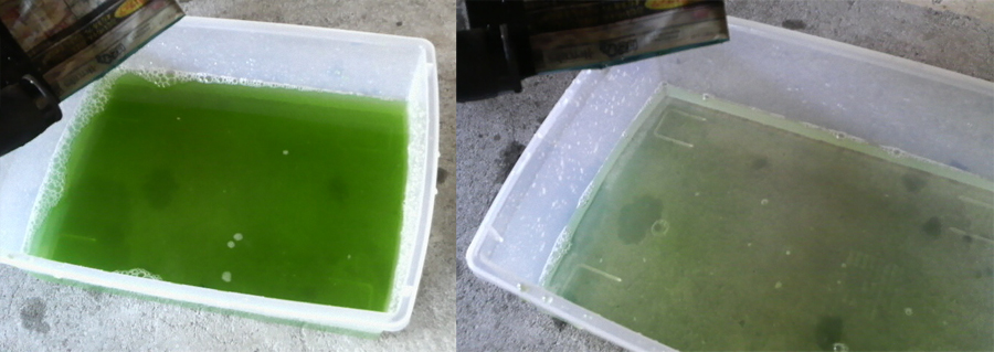 左が1.5リットル流し込んだ時の色。右が更に1リットル流し込んだ時の色です。