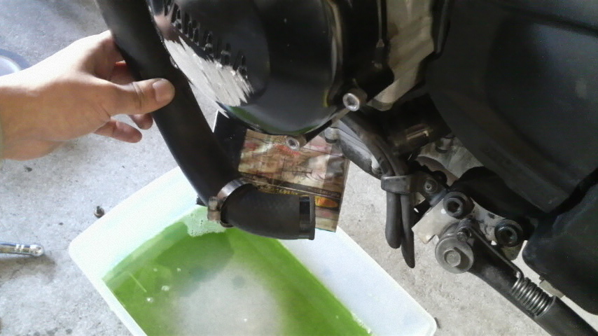 暫く放置してクーラントが出て来なくなったらサイドスタンドの上辺りのラジエターホースも外す。