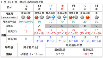 今年はあと1戦、SSKの最終戦に出てみようと思っていますけども、SSKまでは今週末の土日2日間と前日の土曜の3回しか練習するチャンスがないのだけど、今週末の予報はどんな塩梅ですかな…と週間予報をチェックしてみたらこれ。