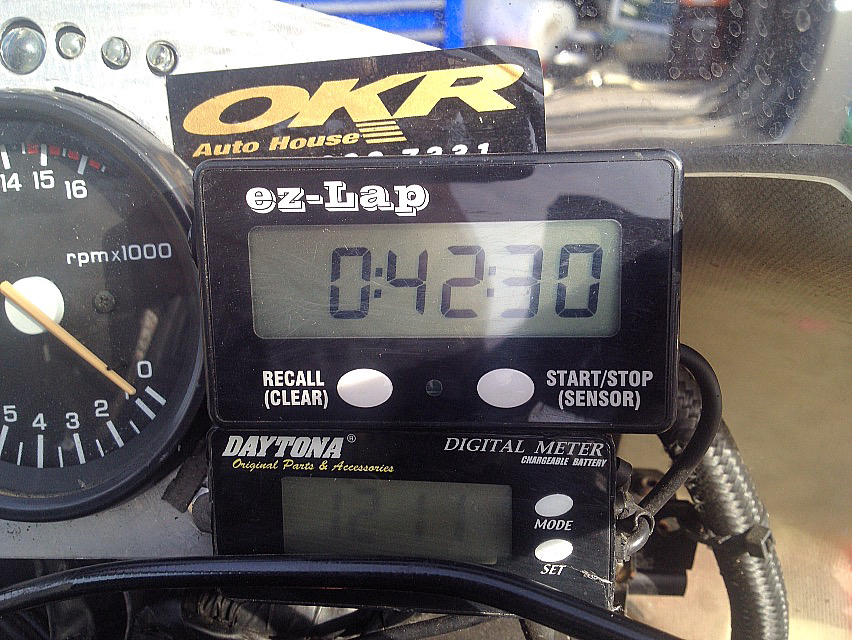 するとコースインしてすぐにモタードの集団に捕まって、43秒ちょいくらいのペースで周回することに。