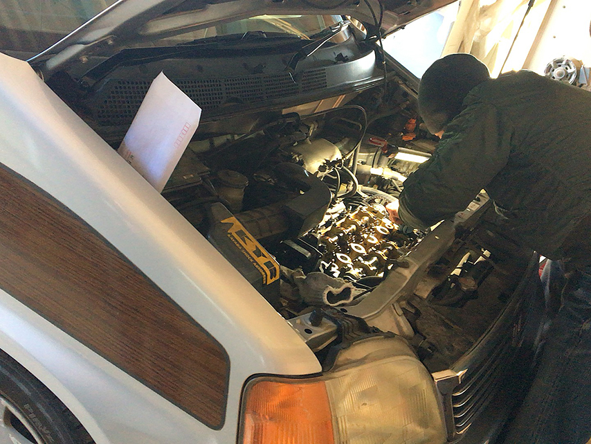 で、着いたそばからナオトさんがさっそくボンネットを開けて作業を開始してくれて、シールを何ヶ所か交換したりしながらエンジンの構造の話しなんかを教えてくれたり、車でサーキットを走る人がなんでエアコンを取っちゃうのかとかそういうのが判ってなるほどな…とか。