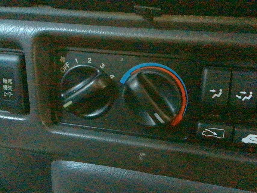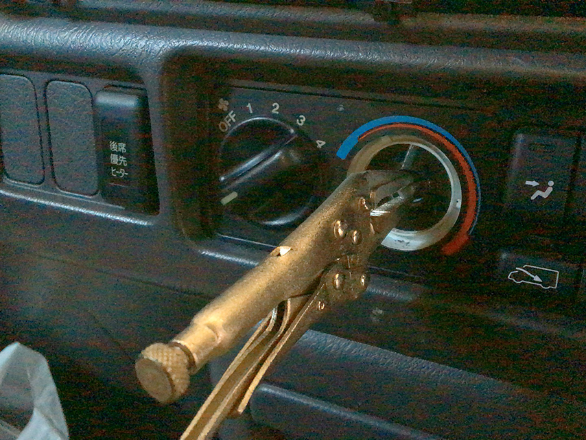 エアコンのノブは、On/Offの方は何とか修正したんですけども、スイッチそのものを留めてるナットが緩んでるらしくて、中でグルグル回ってるんです(笑)