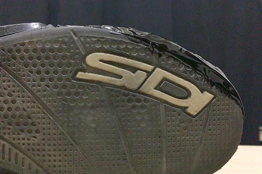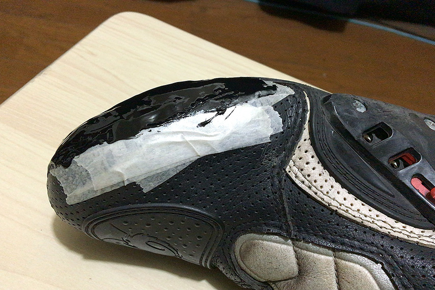 説明書によると付属のヤスリで表面に当たりをつけて…って書いてあったのだけど、このブーツは言ってみればアスファルトで派手に当たりをつけすぎてるような状態なので、表面の汚れだけ取って作業開始。