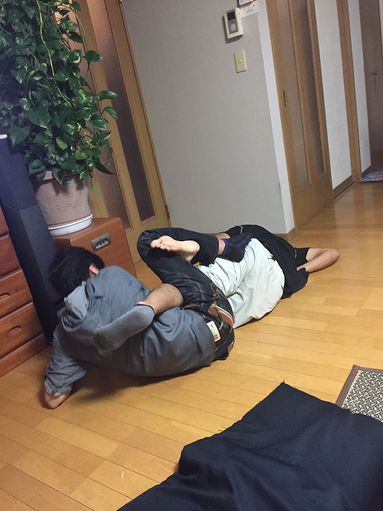 まずはだいぶ酒が進んで足下のおぼつかないNメカさんの両足に足払いを喰らわせて、テイクダウンからの変則四の字固めだ。