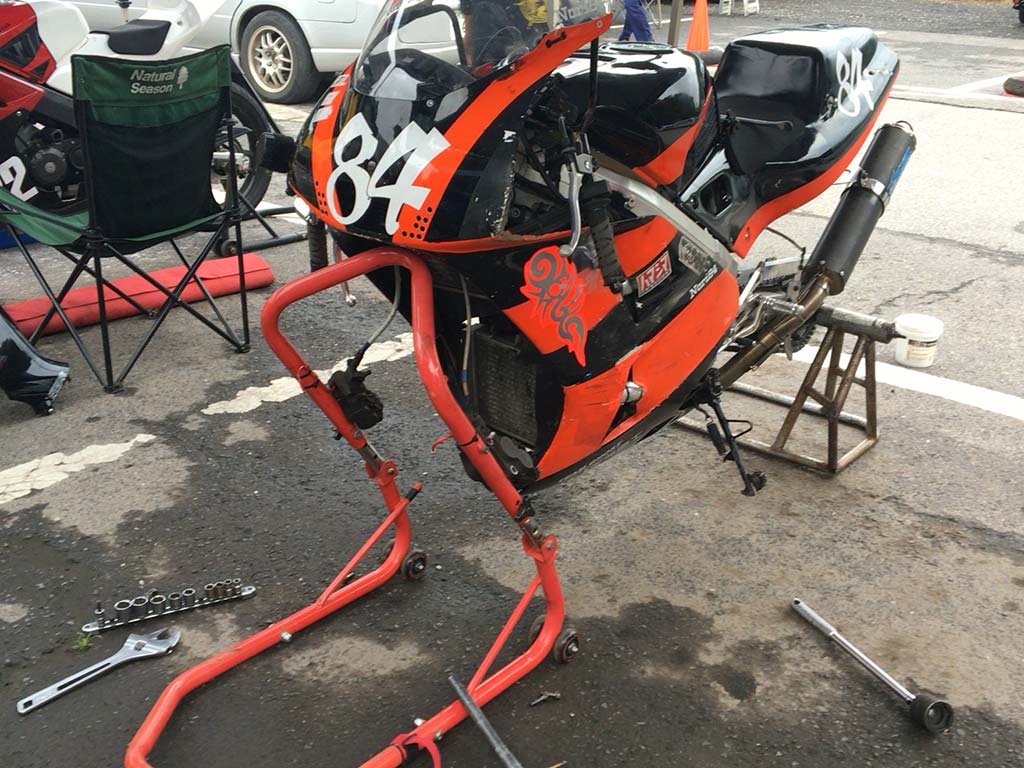 Nメカさんに相談して時間がないながらもエアクリーナーがあまりにも汚いってことで掃除してもらったり、プラグをチェックしてもらったりしたものの、決勝ではスタートから変なトラブルが出て失速、アホほど順位を落として、8位まで頑張って終了。