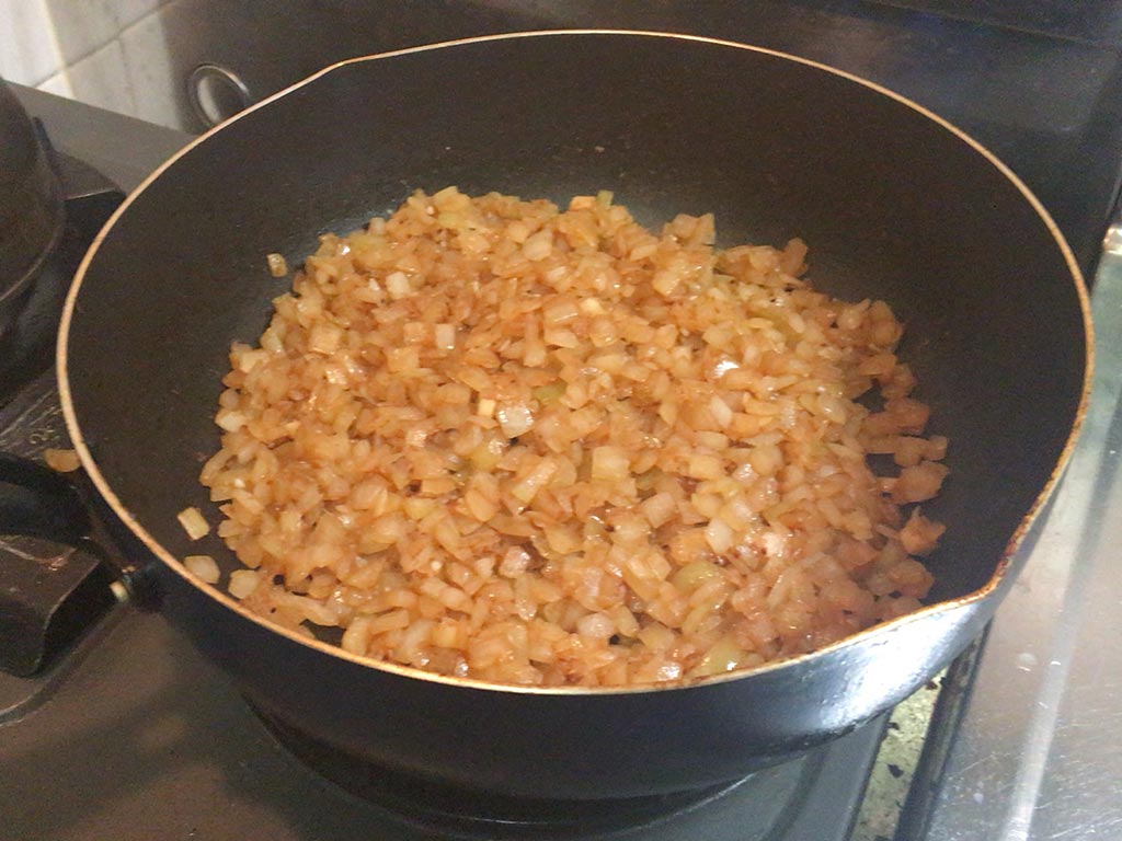 まずはタマネギをみじん切りにして、中火で焦がさないように飴色になるまで炒めます。
