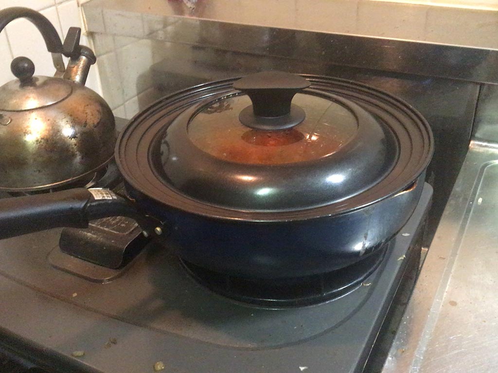 フライパンの中で、タマネギが言い争うような音がかすかに聞こえてきたらフタを取ります。