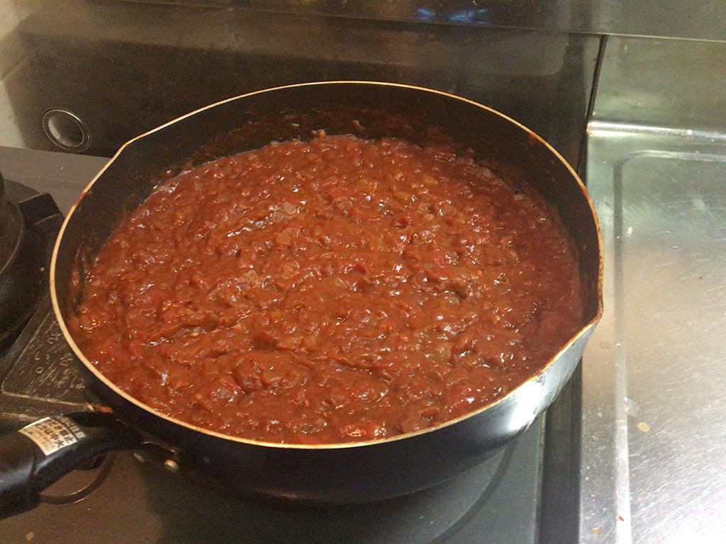 タマネギが香り立って良い色になってきたら、火を弱めて一度フタをして蒸し焼きにします。