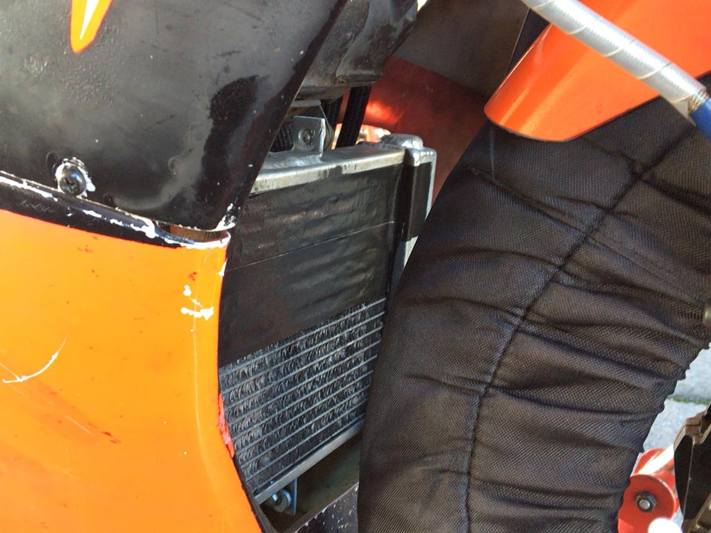 1本目で水温が70度弱くらいまでしか上がらないので、下側のラジエターを半分ガムテで塞いでみた。