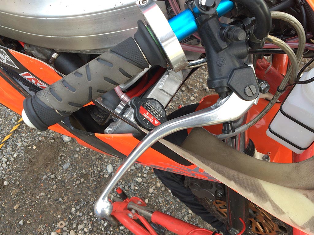 予選をちょいちょい見学したあと、観戦しておきたい決勝までずいぶん時間が空いていたので、午前中の走行枠が濃霧で中止になってションボリしてるYスペくんに頼んで車の駐車場所を変わってもらって、VFRを降ろしてレバー交換とか。