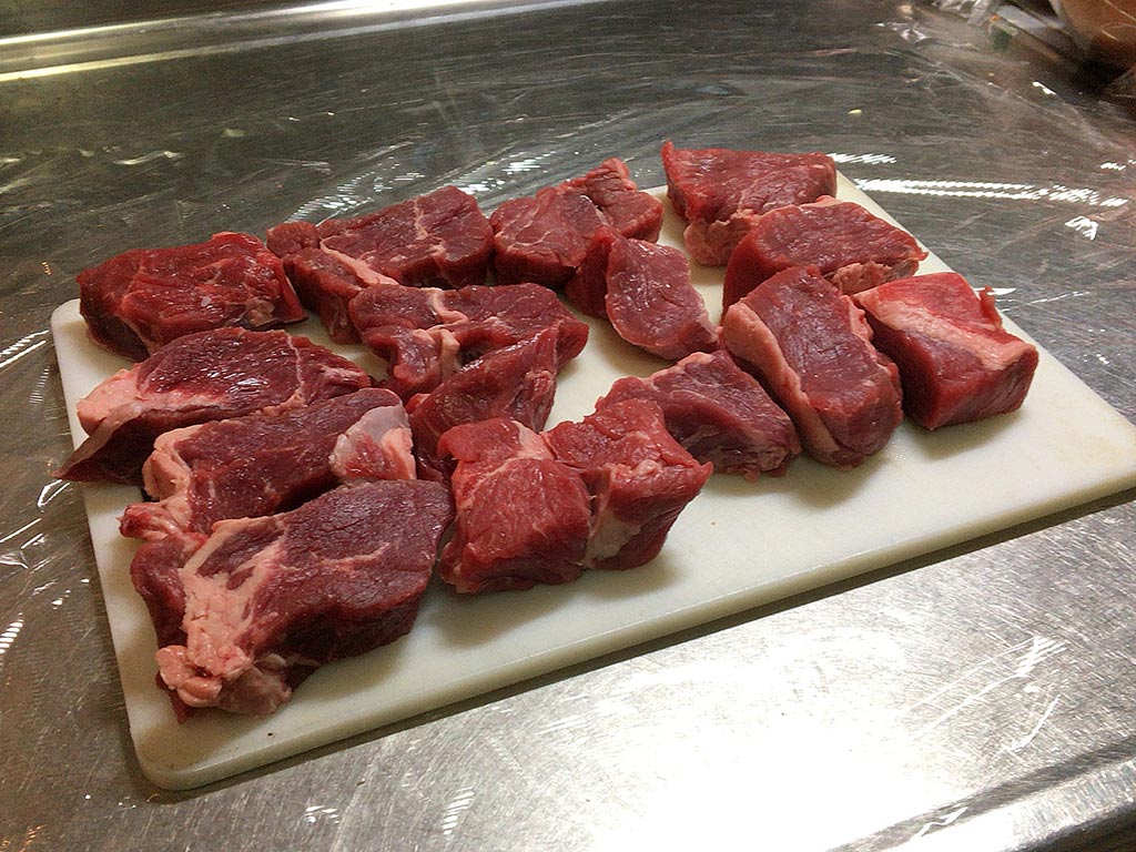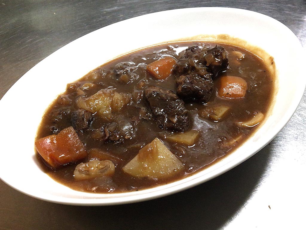 ひとくちでは口に入りきらないくらいの大きさに切った牛肉が圧力を掛けて煮込むとだいぶ縮むんですけども、スプーンでサクッと切れて、噛むと口の中でファサっとほどける。