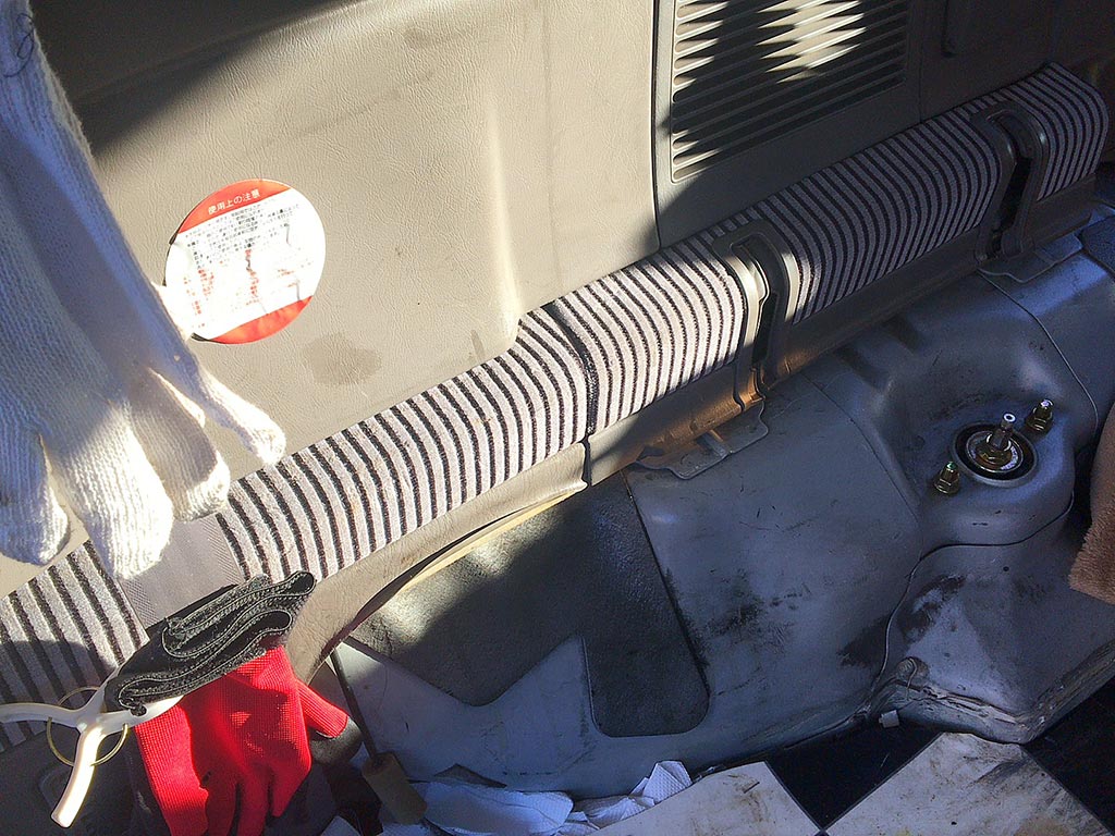 それから、Nメカさんにいろいろやってもらってる間、ステゴンのオイルがまたずいぶん減ってたので足したりしてたんですけども、車内の左後ろ辺りに何かが垂れたような跡があって、良く見たらなにか液体が滴ってるんですよね。