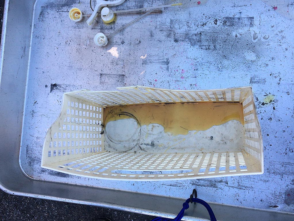中に入ってたパーツクリーナーとかメタルラバーとか掃除用のブラシとかそういうのはなんとか救助したんですけども、カゴの底のチェーンオイルとケミカル類のスプレーノズルは最早パーツクリーナーでは落とせないので諦めて捨てた…orz
