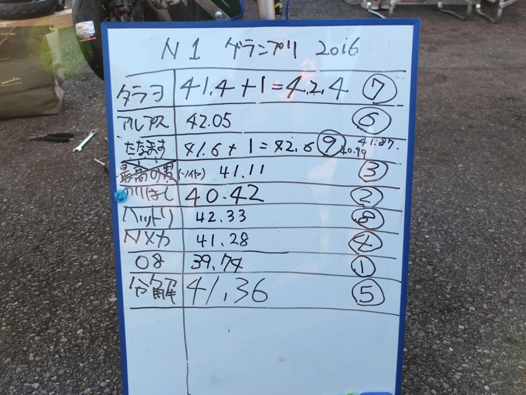 今年のミニにタコの参加者は、稲川さん08くん親子、Nメカさん、ソイヤくん、タラヲさん、ぐっさん、アルプスさん、たなますさん、分解一直線★さん、ハットリ、それから僕で、そのうちKSRタイムアタックバトル改めN1グランプリ2016の参加者は稲川さんとぐっさん以外の9人で、タラヲさんは持ち主なのでプラス1秒ハンデ、たなますさんは今日ビギナー枠をタラヲさんのNS-1で走る予定だったので、たなますさんもハンデプラス1秒。