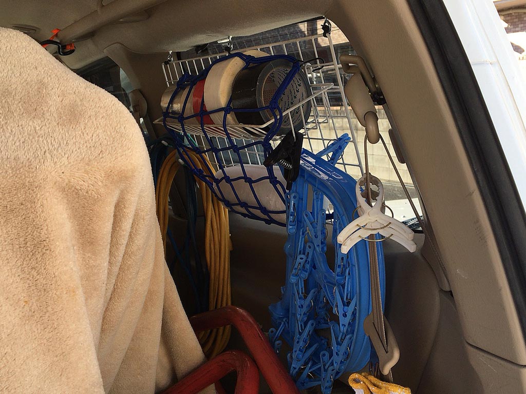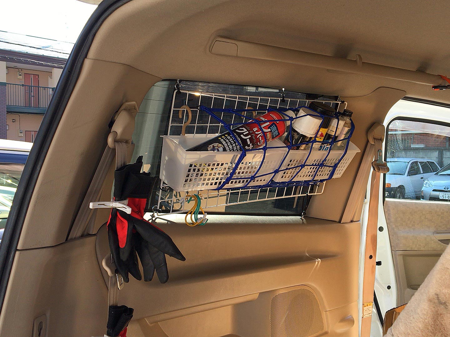 グダグダ楽チンサーキット仕様にした3列目の窓にカゴを取り付けてステゴンの時と同じように戻す。