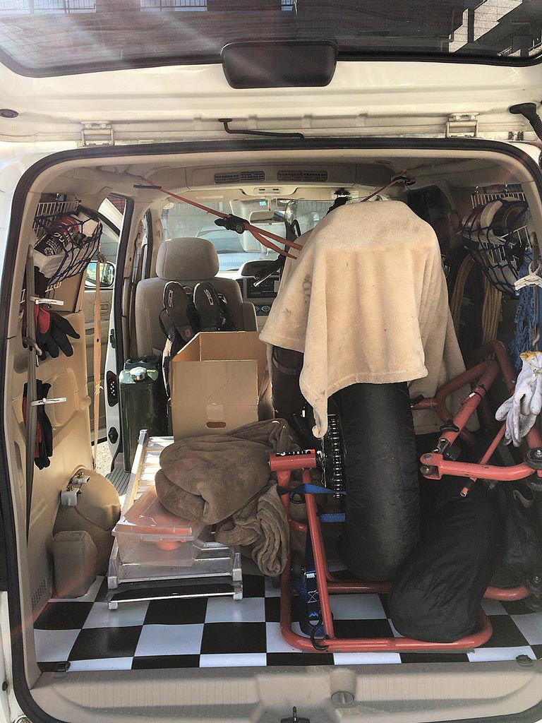 僕はサーキットに練習に出掛けても、コールマンのイスを積んであるにも関わらず出しもしないでリアハッチを開けたところにポツンと座ってることが多いんですけども、その辺りにガムテやパーツクリーナーやらペーパーウェスやらがすぐ手が届くところにいつもあるってのがとても便利なんですよねf(^_^;)