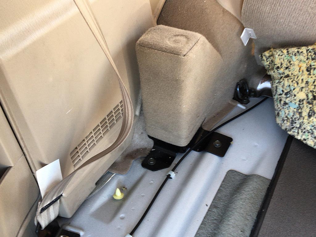 その時に、初めてセレナにVFRを積んだ時に邪魔で邪魔で、憎たらしいとすら思っていたあの突起。これって外れないもんですかねぇ…と相談したら、掴んでグイグイ揺すると少し動くので、外れんだろ♪っつって、床を剥がしてみたら下で2本、上から1本ボルトで固定されていた。