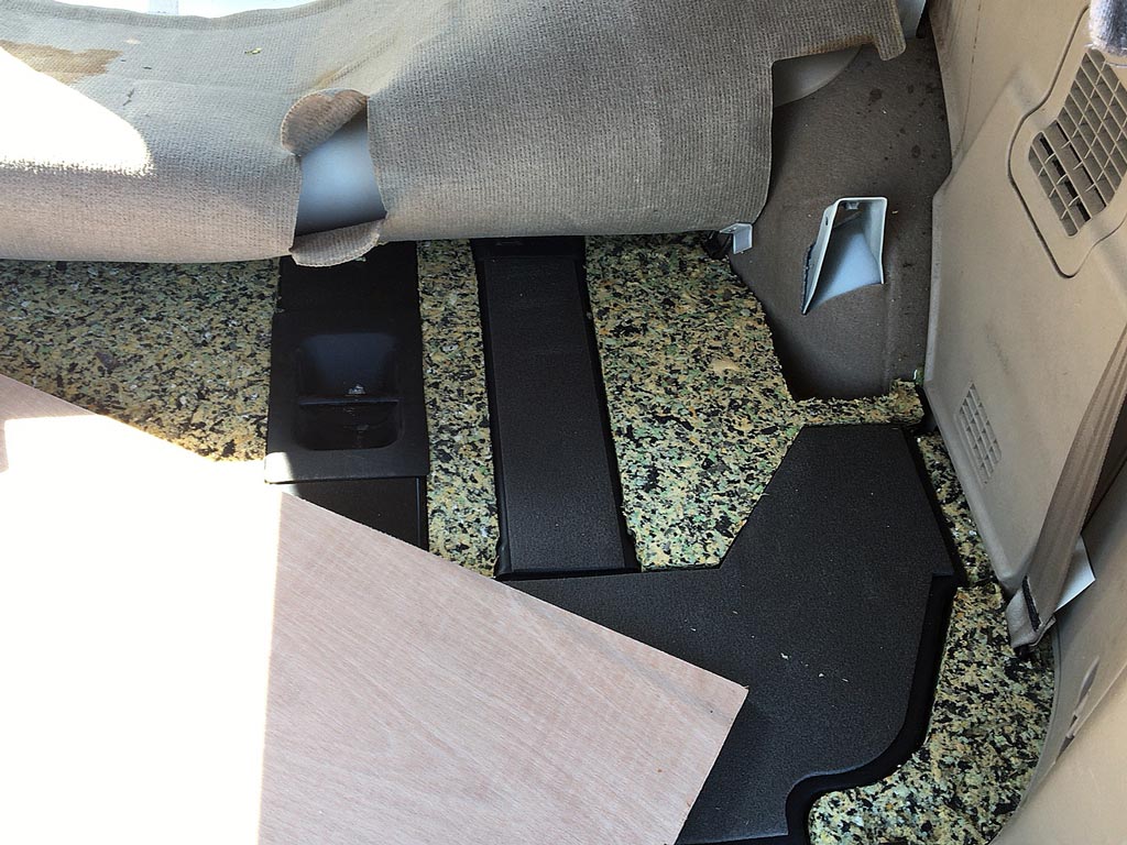 あの突起を取り外した後もステーみたいなのが残るのだけど、それはスタンドの邪魔にはならないので良いとして、今日見てみたらJ-Tripのローラースタンドのローラーが乗ってるところがずいぶん凹んでて、他にも荷室で膝をつくとスゲー沈むところと固いところがあるのが気になって、元の床のカーペットみたいなヤツを剥がしてみると要所要所に固いスペーサーみたいなのがある以外は吸音材みたいなやつが敷き詰めてあるだけで、そりゃぁバイクなんか載せたら凹むわ、と。