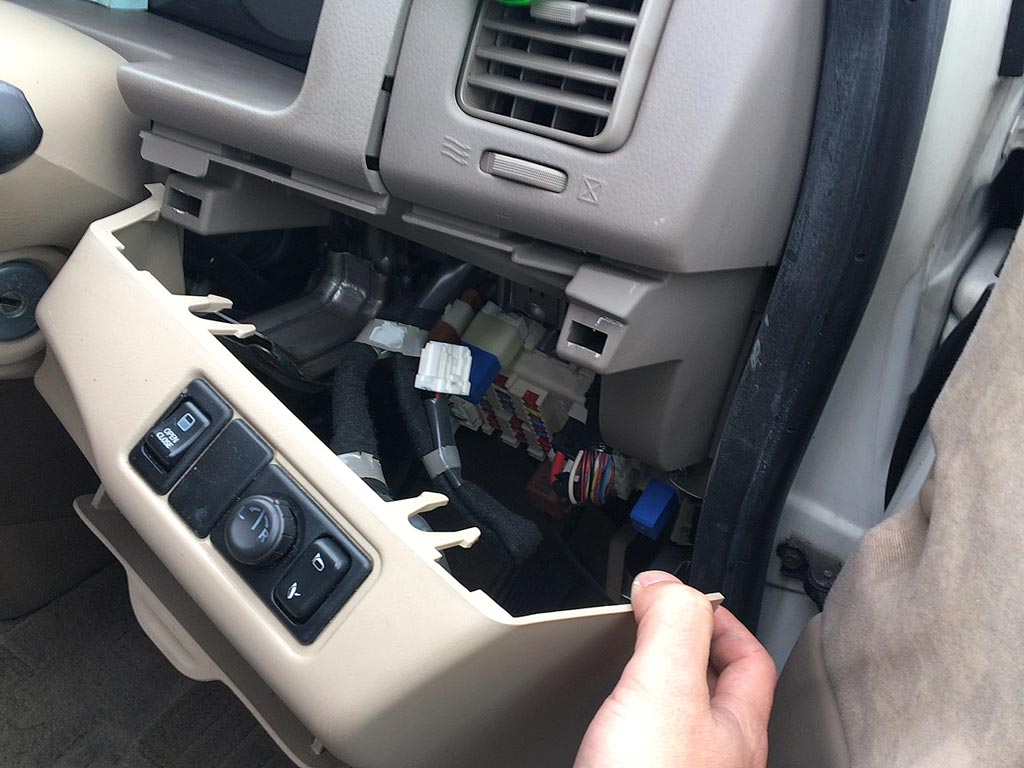 駐車場に行って車の中でまず運転席のライトを眺めてみると、商品ページに書いてあった通り、ライトのカバーを外すくぼみみたいなのがあった。