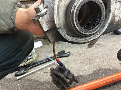 まずは左側が指で回すとゴリゴリいっていたフロントホイールのベアリング交換。