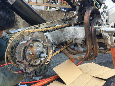 それから、今日の一番大事な作業はチェーンを525から520にコンバートするっていうことなんですけども、スプロケ変えた時にVFRのチェーンの調整ってなんであんなに固いんですかねぇ…って話しをしていたら、『いや、そんなはずはないぞ??』と。
