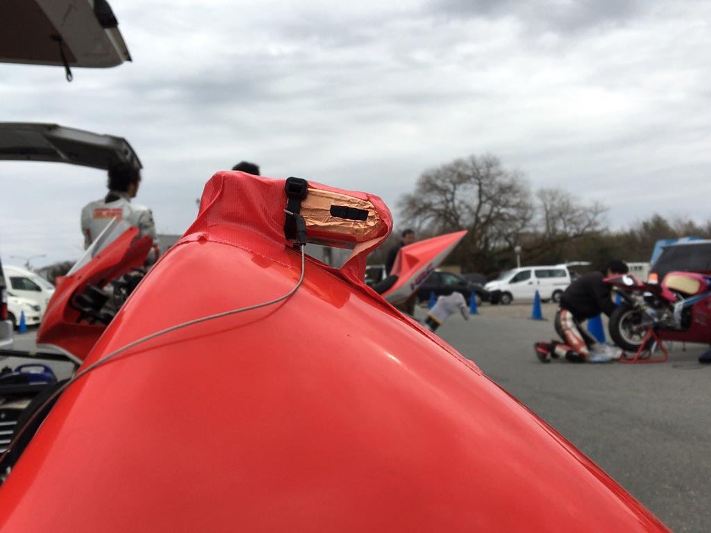 それから先週の練習の時にはカウルの頂点にこんな感じでガムテープで固定して、隙間にガムテをグルグルまとめたやつを詰めて横も貼っておいた。手作りタンクパッドみたいな感じに。