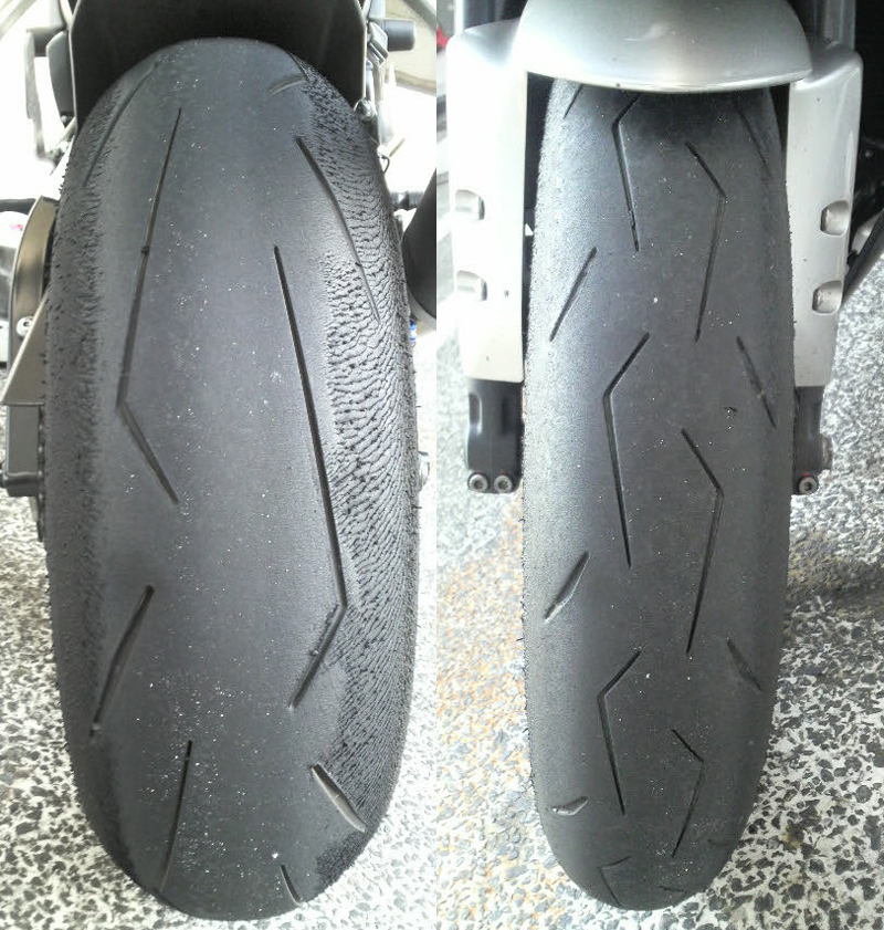 コーナー中にトラクションが抜けてだいぶリアを滑らせてしまったせいで、極端にリアだけ減ってしまった。