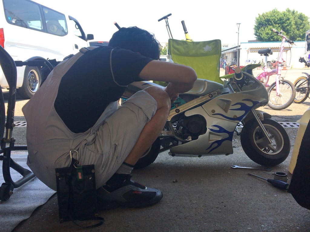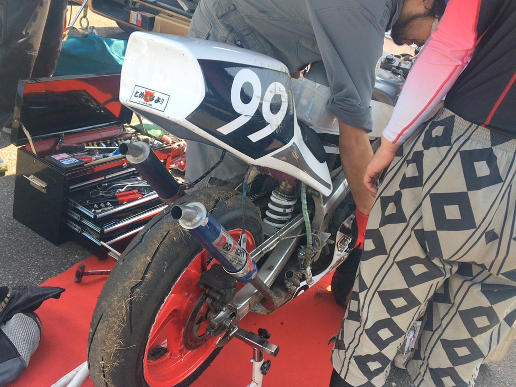 鬼装改のパドックに戻って、ひとまず戻らなくなったスターターのところをバラして、ずいぶん抜けていた空気も入れて、燃料を入れてコックをオン!コイルを引っ張る!