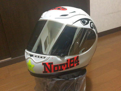 一時期ヘルメットにいろんなカッティングを貼ったり剥がしたり、毎レースごとにいろいろやって遊んでた時期があったのだけど、最近はあまり気にしなくなって口のところのスターとほっぺのNori84、それから側頭部に目玉とひらがなの『のり』という文字を組み合わせたトライバル風のカッティングシートが貼ったままになっていた。