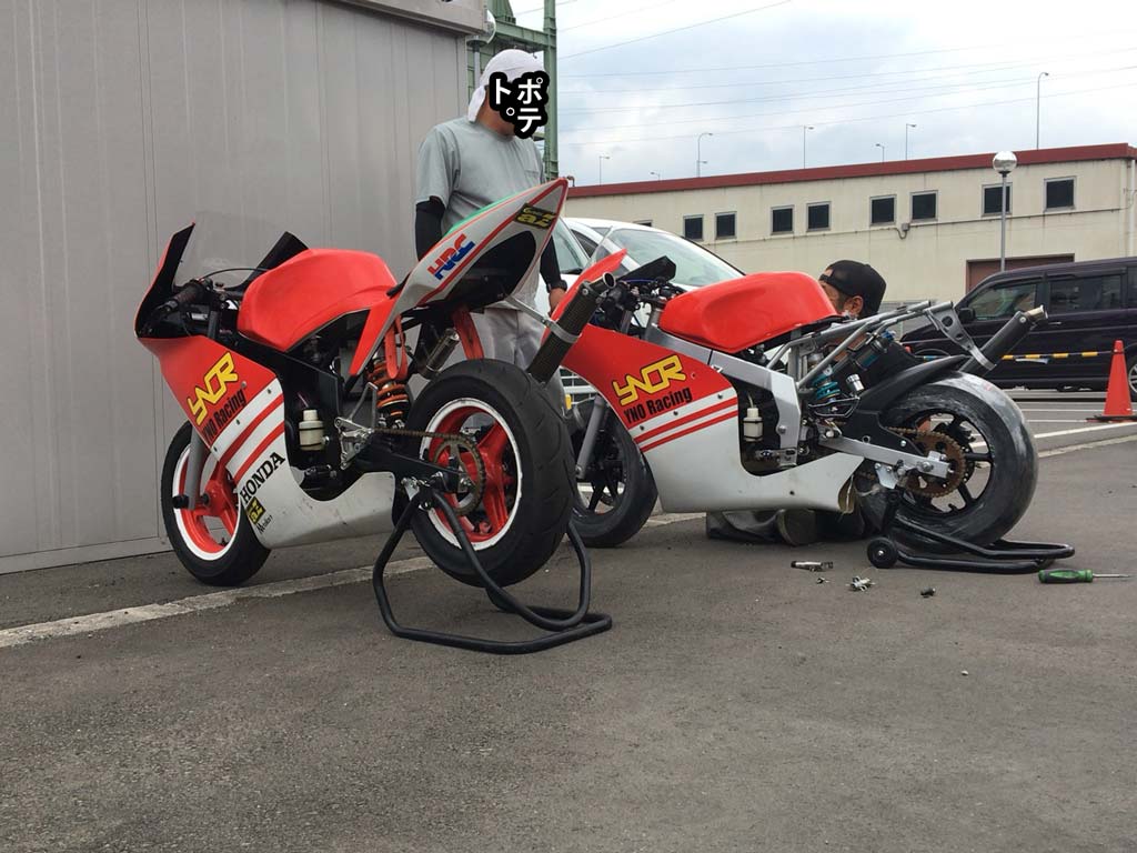 明後日は日光サーキットの二輪走行日なので、25日の耐久まで練習に出掛けられないハットリとタラヲさんの代わりに80(写真手前)のテストとセッティング、それから50(写真奥)のチャンバー交換後のテストなんですけども、50のカウルは今ペイントファクトリー稲川麗心愚に塗装に出掛けているので、明後日の走行用に前のカウルに戻したりしていて、今までのステーと変わってるのやら何やら、フィッティングをやり直したりしていてドタバタ。