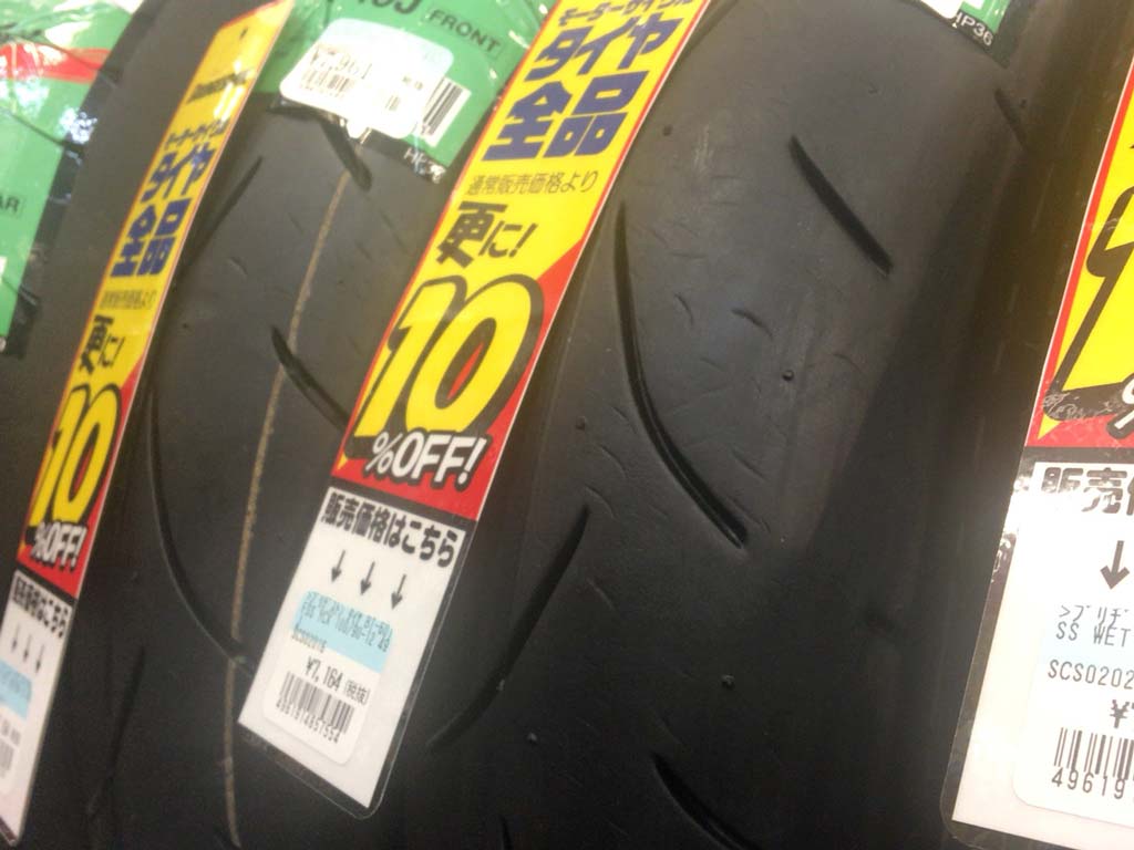 ボスと一通り店内をウロウロして、25日は雨よな…と、タイヤコーナーに1セットのみ在庫していたブリヂストンのレインタイヤを眺めていたのだけど、その隣りのタイヤ!