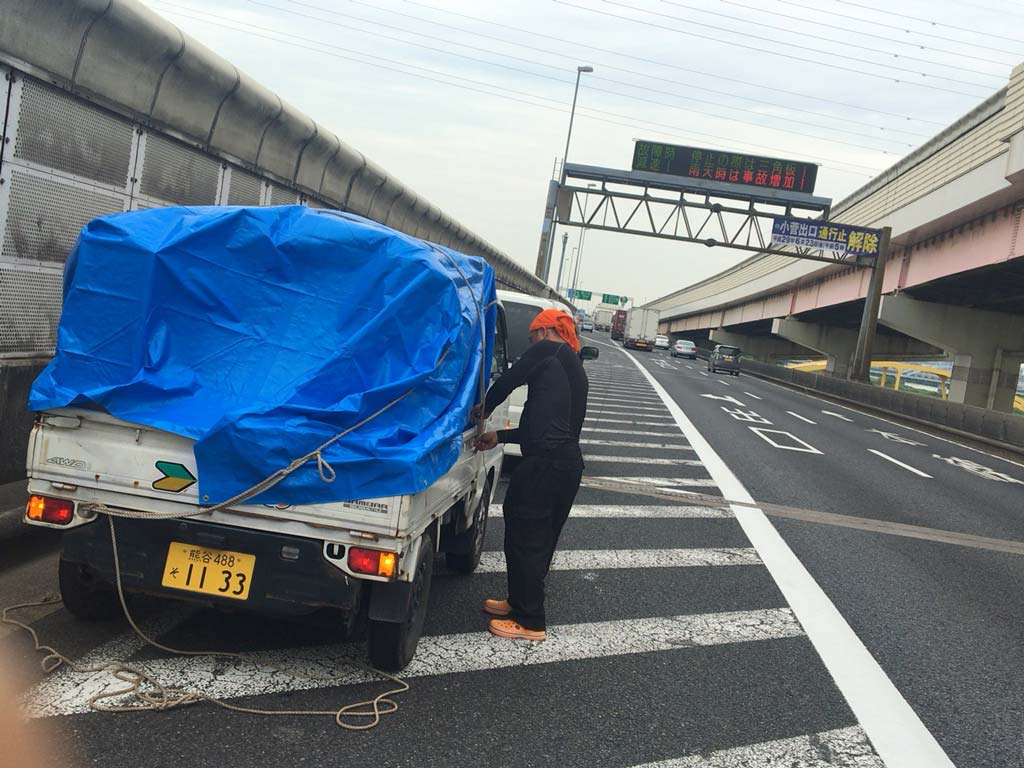 そういった訳で、高速道路で大きな荷物をドンガラガッシャーンするよりは、停まってはいけない場所でちょっと数分停めさせてもらう方がマシだと自分に言い訳をして工場長が急いで南京縛りで荷台をしばく。
