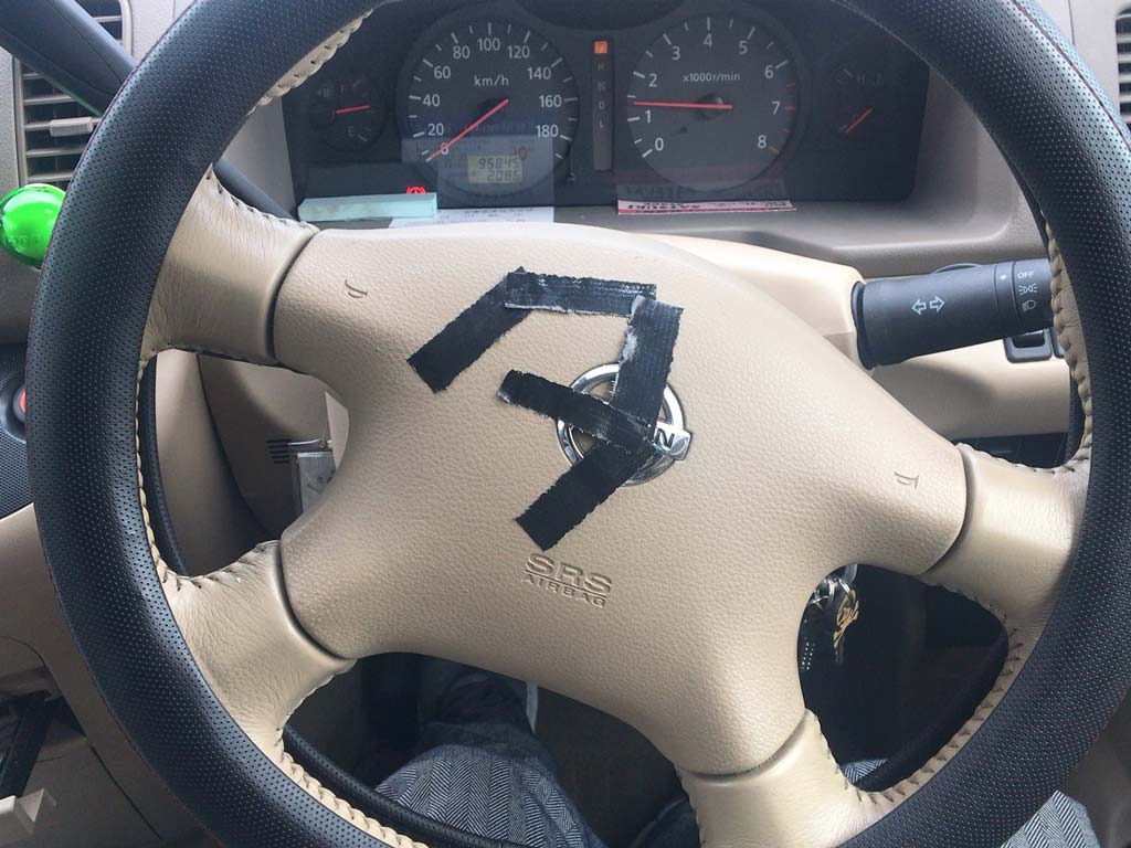 そんでいつものように赤外線の発信機をコンクリートウォールにガムテープで貼り付けるんですけども、千葉の真ん中の方に引っ越した自分としては、那須塩原のサーキットに発信機を置き忘れたりしたらそれはそれはもう大惨事なので、発信機を仕込んだ直後に車のハンドルにガムテで印をつけといた。