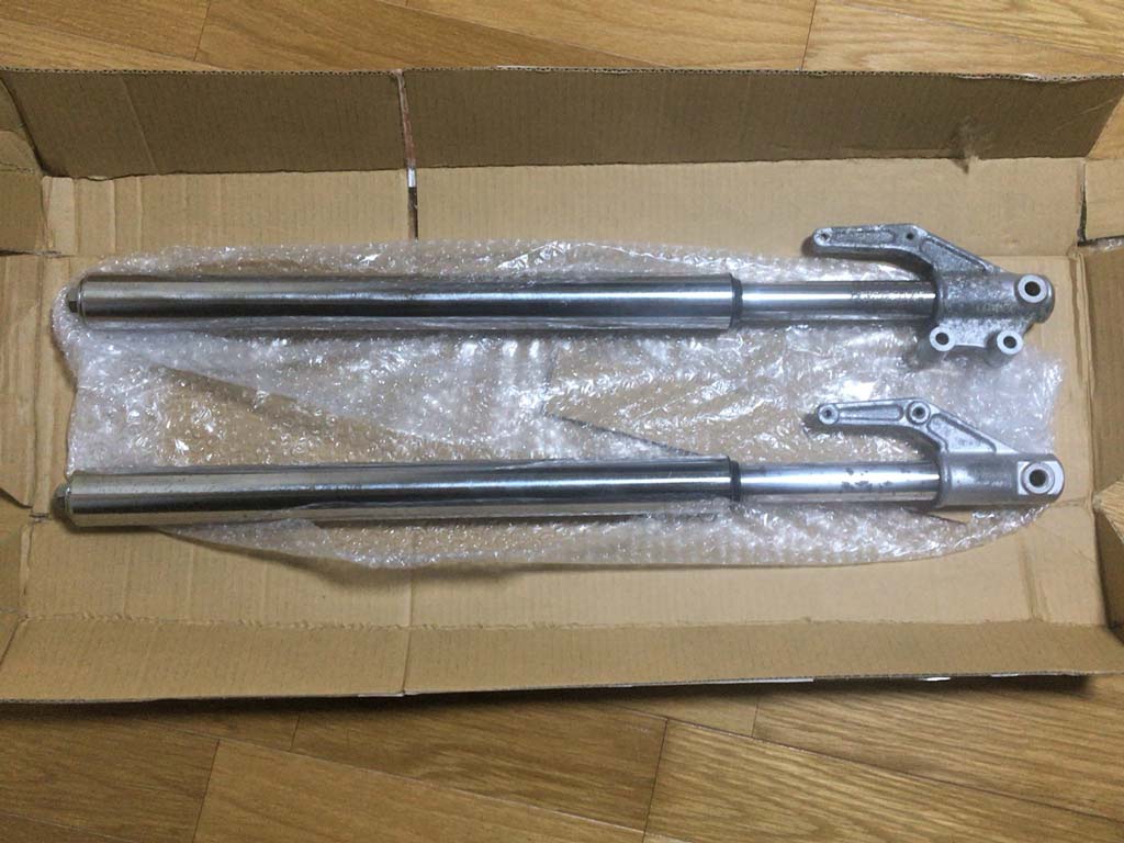 少し前にストリートマジック50のフロントブレーキまわりを買ったんですけども、同じ日に落札しておいた、これまたストリートマジック50のフロントフォーク左右セットもやっと届いた。