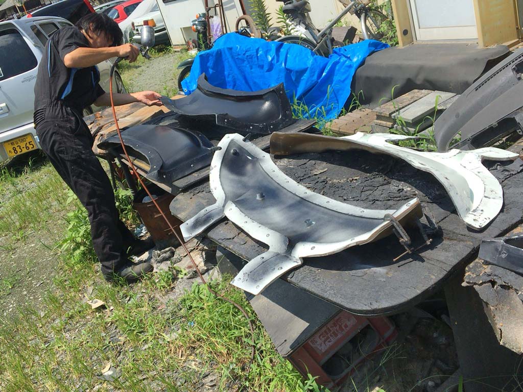 拭き取りが終わった型は外に運ばれて、若手ナンバーワン選手、ヅッカーパイセンが黒ゲルコートを吹いているいるのを見学。