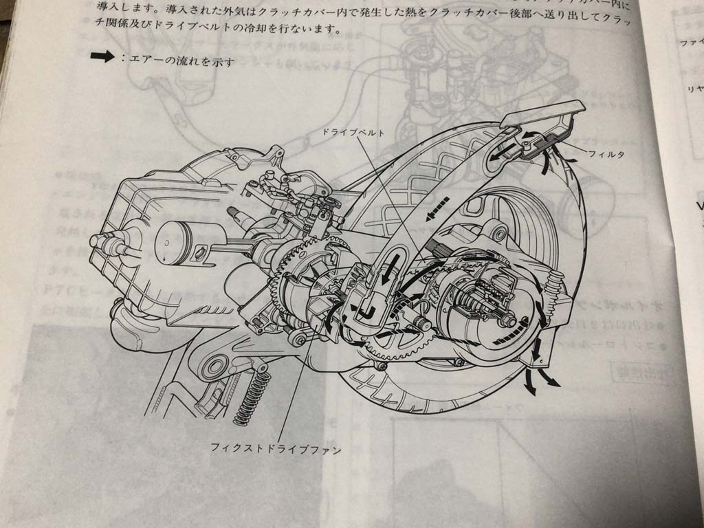 どうやらアドレスV100の前期エンジンはクランクケース内の熱がかなりの問題だったらしく、その熱対策で後期エンジンではクランクケース内に風を送り込んで後ろの下から排熱するっていう仕組みになったと聞いたんですけども、まさにその通りの図解ですね。