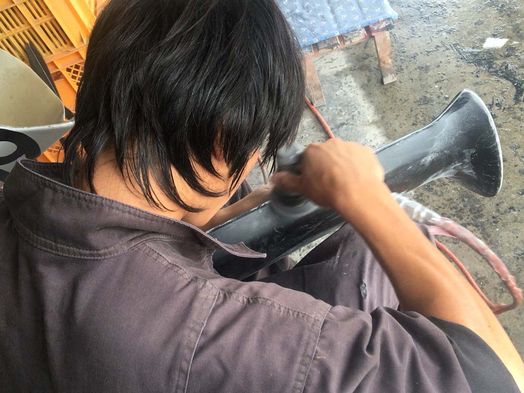 そんなヅッカーパイセンの朝イチの仕事は、今月頭にFRP修行に来た時に僕が型を削り過ぎてやらかしたウィングの手直しと仕上げ…。