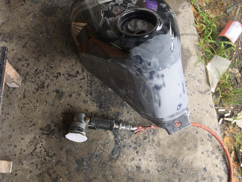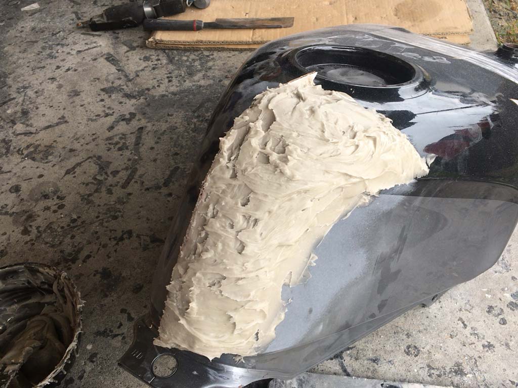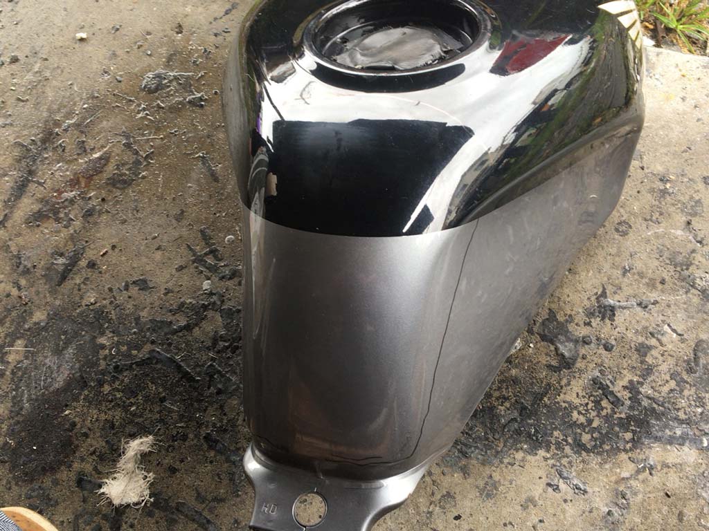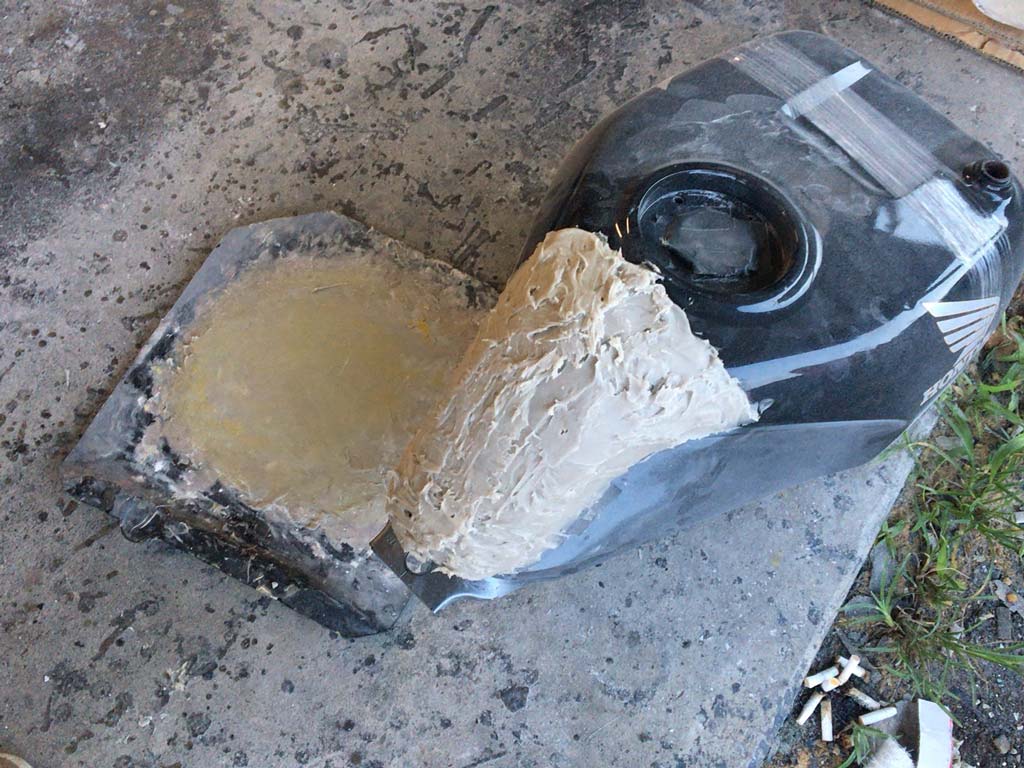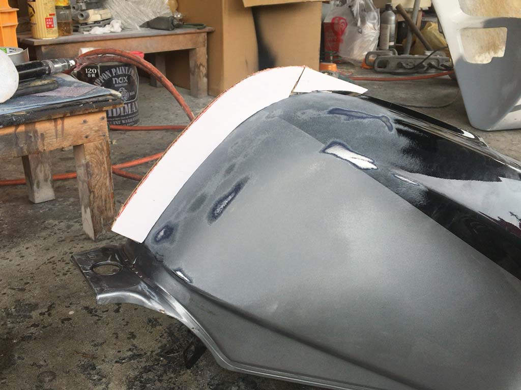 このタンクは純正の位置から3cm下げた形でタンクカバーを作るってことで、そのための型を作る準備をするのらしい。
