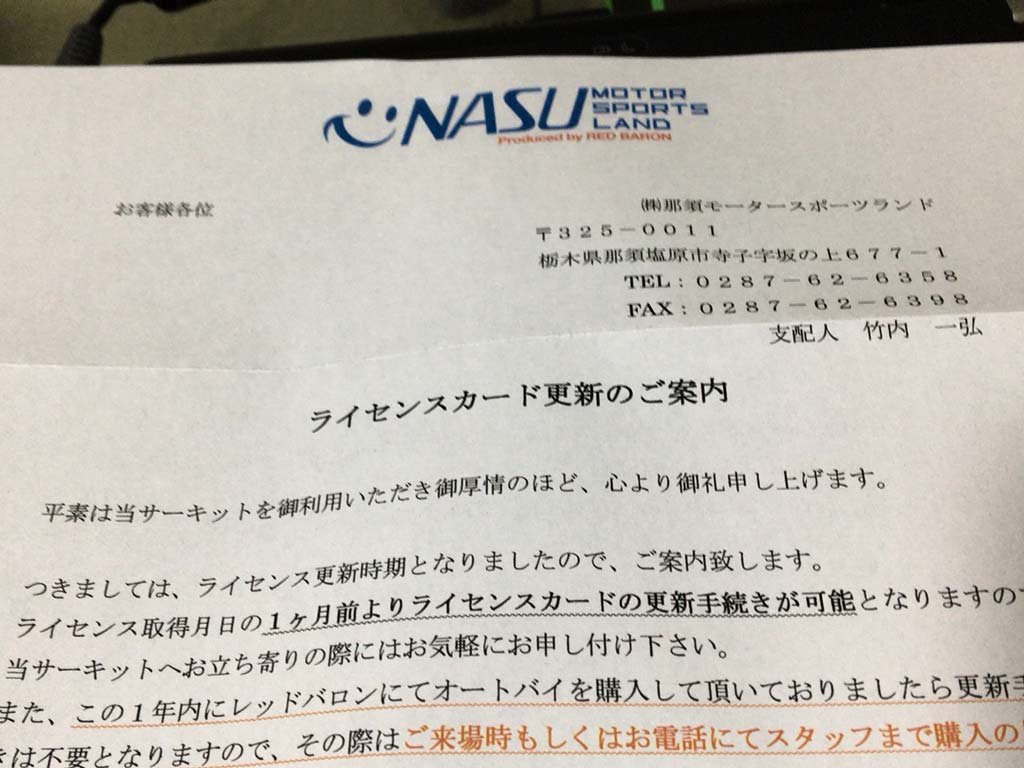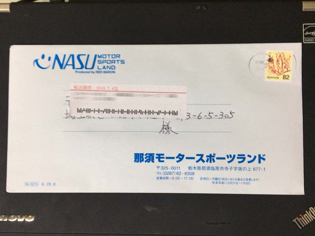 那須モータースポーツランドから封筒が届いていた訳ですけれども。