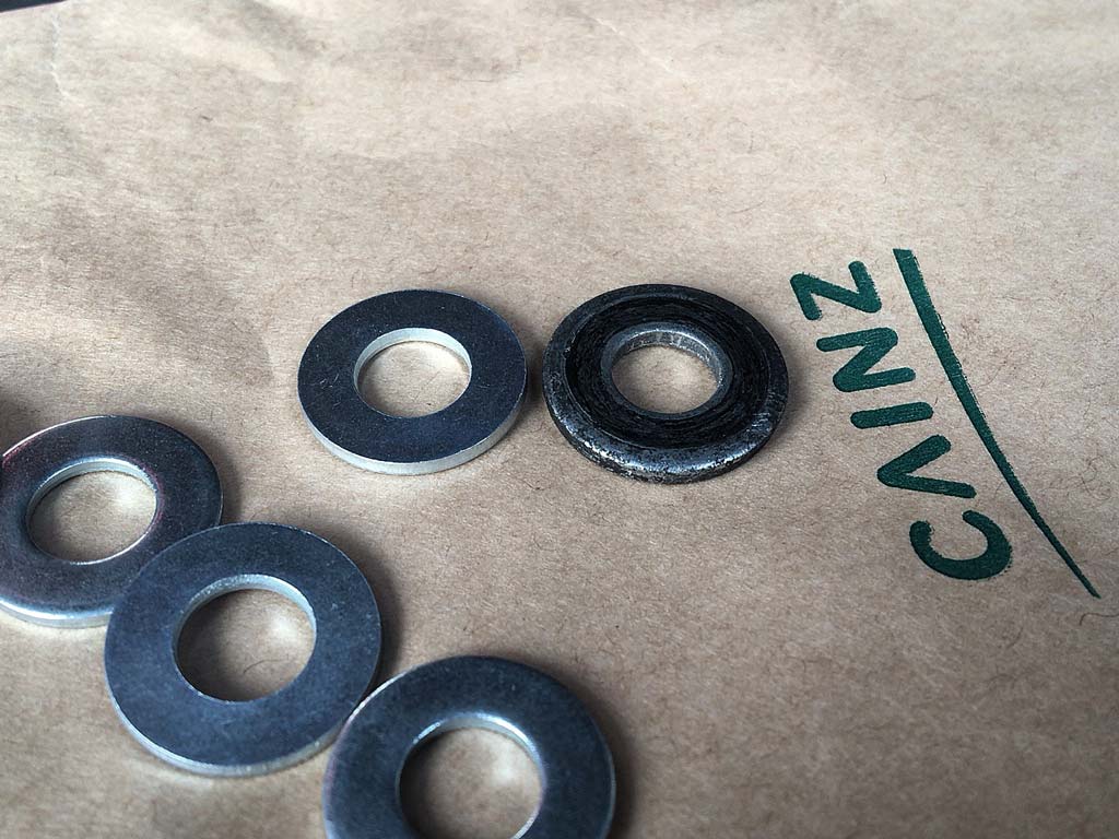 内径8mm、外径19mm、厚さ2mmのワッシャーを探したのだけど、まったく同じのは売ってなかったので、内径8mm、外径17mm、厚さ1.6mmのを6枚買ってきた。