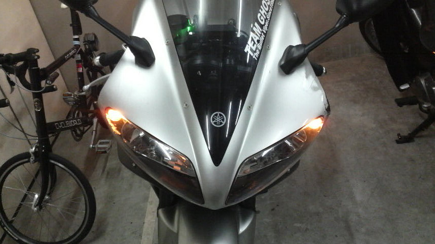 で、これはR1に限った事じゃないですけど、ウィンカーって視認性が高くないといかんもんだからだいぶ出っ張ってんですよね。