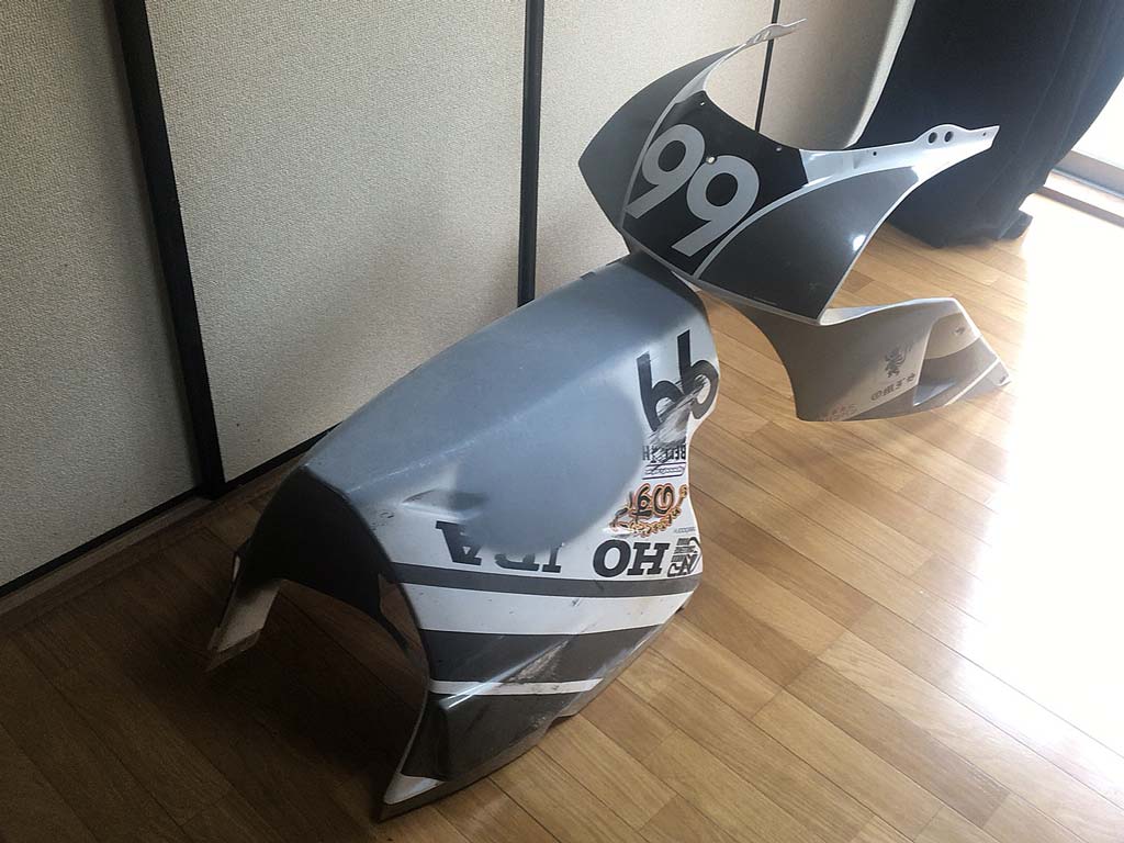 もひさんは少し前にジャガイモ工場(FRPの方)にカウルの補修とモディファイを依頼していて、主にナックルの粉々になっている部分の修理と、アンダーカウルの分割する場所を変更するっていうような内容だったと思うのだけど、それが終わったっていうことで僕がカウルを預かってたんですね。