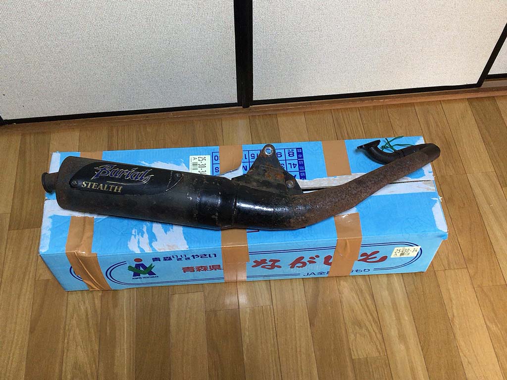 なんかこう…今まで着けていたノーマル風のパチモンマフラーが3カ月もしたら嫌な錆び方をしてきたのと、設計が無茶苦茶でエキパイがずいぶんひん曲がって着いてるのと、あと無暗やたらと重いのが気に入らなくて、やっぱりちゃんとした純正マフラーを買おうと思ってヤフオクを見ていたら、確か即決1万円の最落設定なしのこのマフラーが出品されていて、昔からベリアルサービスには良いイメージを持ってたのと、ステルスは割と静かだっていう噂なのでそれとなくポチっておいた。
