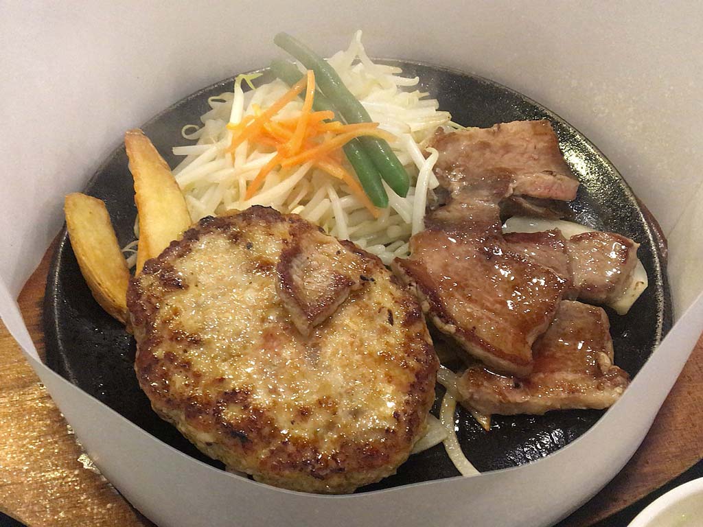 今日は何かと頑張ったので人がこねくり回した牛や既にカットされた牛ぐらい食べても罰は当たるまい、と思って頼んでみた200gハンバーグと180gカットステーキのコンボ。